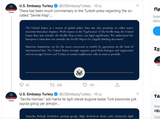 Η Αμερικανική Πρεσβεία στην Τουρκία, μέσω «Twitter», δημοσιοποίησε τη θέση της, και τη θέση της Αμερικανικής Κυβέρνησης για τον περίφημο «Χάρτη της Σεβίλλης». Αναφέρει χαρακτηριστικά…