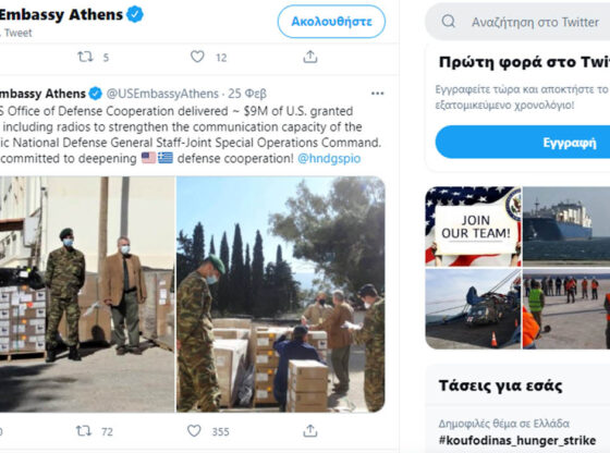 Η Αμερικανική Πρεσβεία στην Ελλάδα ανακοίνωσε, στις 25 Φεβρουαρίου, μέσω του «Twitter», ότι το Αμερικανικό Γραφείο Αμυντικής Συνεργασίας παρέδωσε αμυντικό υλικό, μεταξύ των οποίων και…