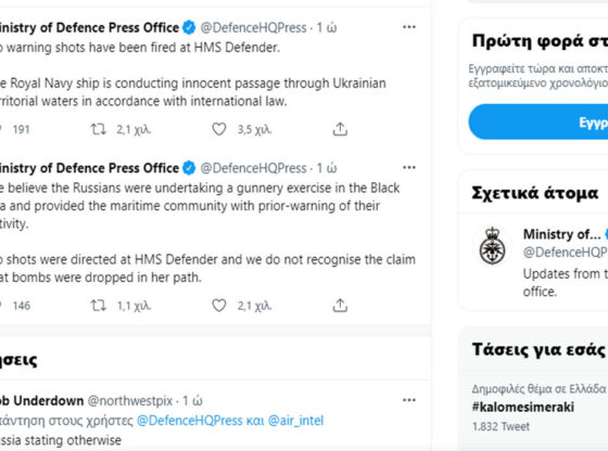 Με ανακοίνωση του το βρετανικό Υπουργείο Άμυνας διαψεύδει την είδηση περί προειδοποιητικών βομβών στην πορεία του αντιτορπιλικού HMS «Defender» από ρωσικό Su-24. Όπως αναφέρει η…