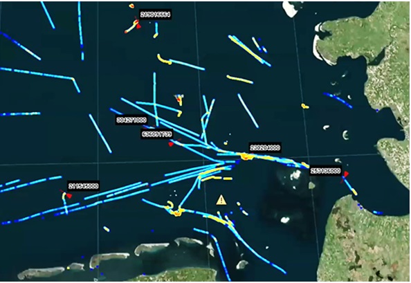 On this figure you can see that an area on the satellite imagery is indicated as a vessel. This area is correlated with known, recorded tracks of all vessels. As soon as a vessel enters the buffer area around the object on the image, that vessel is likely to be the same. That way you can identify vessels on the satellite imagery but you can also find out which vessel was able to stay off the radar.