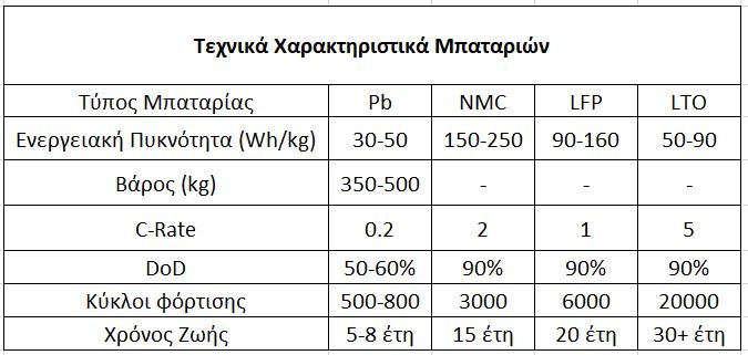 Επίσης πολύ σημαντική παράμετρος είναι και ο χρόνος φόρτισης. Όπως βλέπουμε στον πίνακα οι μπαταρίες NMC με C-Rate 1C έχουν πέντε φορές πιο γρήγορο χρόνο φόρτισης σε σύγκριση με τις μπαταρίες μολύβδου-οξέος με C-Rate 0,2C ενώ οι νεώτερες LTO έχουν έως και 25 φορές πιο γρήγορο χρόνο φόρτισης.