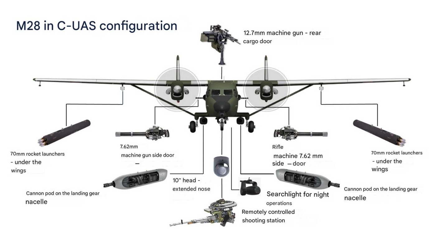 H PZL Mielec προτείνει την εγκατάσταση πολυβόλων M-134, των 7,62 χιλιοστών, κατηγορίας Gatling, στις δύο πλευρικές θύρες του αεροσκάφους. Ένα επιπλέον πολυβόλο, των 12,7 χιλιοστών (σε τηλεχειριζόμενο σταθμό), θα τοποθετηθεί στο πίσω μέρος της ατράκτου, ατρακτίδια κατευθυνόμενων ρουκετών ή/και πυροβόλων των 20 χιλιοστών στις πτέρυγες. Επίσης, το αεροσκάφος θα εφοδιαστεί και με ηλεκτροπτικό αισθητήρα για επιχειρήσεις ημέρα και νύχτα. Η συγκεκριμένα διαμόρφωση θα επιτρέψει στα Μ-28 να αντιμετωπίζουν απειλές που κινούνται με ταχύτητες 100-200 χιλιομέτρων την ώρα και σε ύψος, στο οποίο μπορεί να πετάξει το M-28. Να σημειωθεί ότι η Πολωνία διατηρεί σε υπηρεσία 42 M-28, εκ των οποίων 25 ο Στρατός, 16 το Ναυτικό και ένα η Υπηρεσία Φύλαξης Συνόρων.