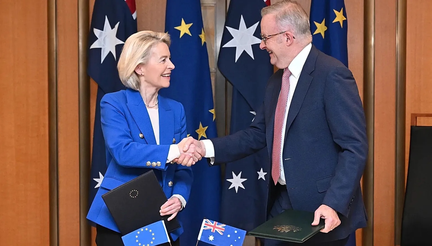 Η Αυστραλία και η Ευρωπαϊκή Ένωση υπέγραψαν σήμερα στην Καμπέρα ευρεία συμφωνία ελεύθερου εμπορίου, καρπό πολυετών διαπραγματεύσεων, με σκοπό να τονωθεί το διμερές εμπόριο, παρά τις έντονες διαμαρτυρίες ευρωπαίων αγροτών. Το κείμενο υπογράφτηκε κατά τη διάρκεια της πρώτης επίσκεψης που έκανε στη χώρα αφότου ανέλαβε το αξίωμα η πρόεδρος της Ευρωπαϊκής Επιτροπής, η Ούρσουλα φον ντερ Λάιεν, ενώ οι δυο εταίροι είναι αντιμέτωποι με ολοένα πιο έντονη αβεβαιότητα εξαιτίας του πολέμου στη Μέση Ανατολή.