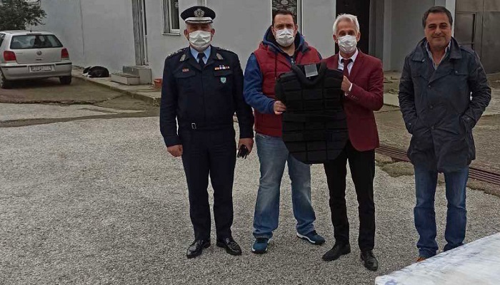 Ο διευθυντής του εργοστασίου καλωδίων Ξάνθης κύριος Γιώργος Χριστοδουλόπουλος παρέδωσε τις ειδικές προστατευτικές στολές στον κύριο Πασχάλη Γιώρα, αστυνομικό διευθυντή Ξάνθης, παρουσία του Δήμαρχου Ξάνθης, κυρίου Μανώλη Τσέπελη.