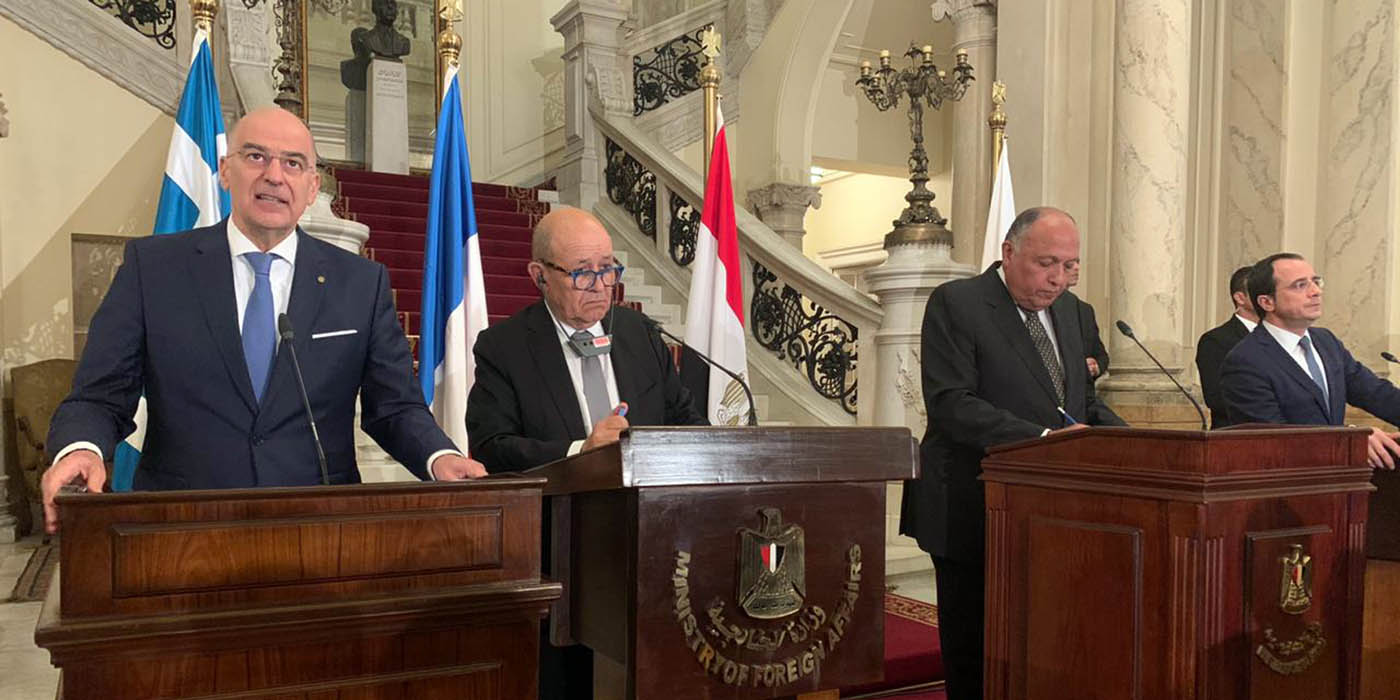 Την ομόφωνη απόφαση των κρατών που συμμετείχαν στη συνάντηση των υπουργών Εξωτερικών Ελλάδας, Αιγύπτου, Κύπρου, Ιταλίας και Γαλλίας στο Κάιρο, ότι οι συμφωνίες μεταξύ Τουρκίας και Σάρατζ για την οριοθέτηση θαλασσίων ζωνών και η συνεργασία στον τομέα της ασφάλειας είναι άκυρες και χωρίς ισχύ, εξέφρασε ο υπουργός Εξωτερικών Νίκος Δένδιας. Σε κοινή συνέντευξη Τύπου με τους υπουργούς Εξωτερικών Κύπρου, Αιγύπτου, Ιταλίας και Γαλλίας, που πραγματοποιήθηκε στο Κάιρο μετά τη συνάντησή τους, ο κ. Δένδιας χαρακτήρισε παράνομη την απόφαση της Τουρκίας να αναπτύξει στρατεύματα στη Λιβύη.