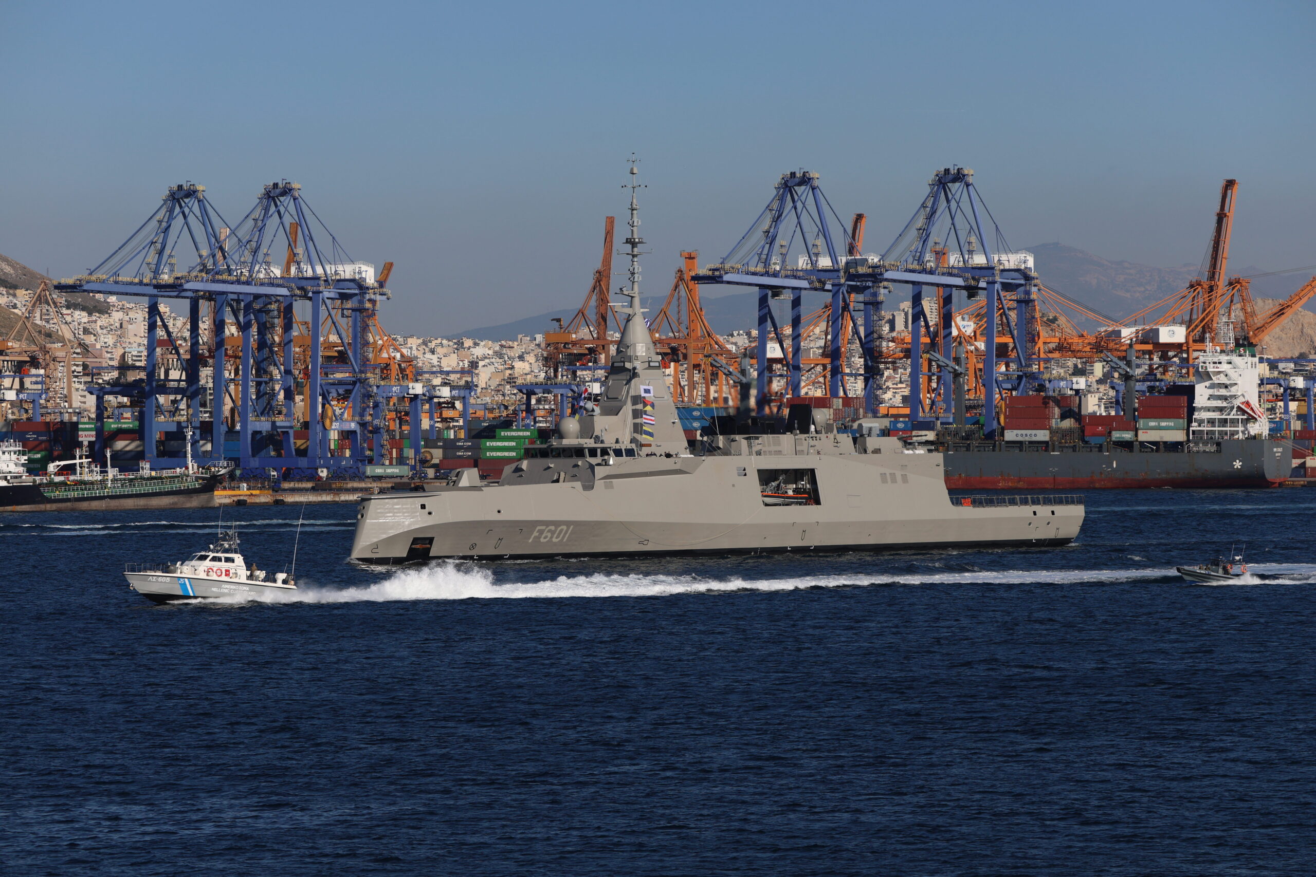 Ο Πρόεδρος της Δημοκρατίας, Κωνσταντίνος Τασούλας, παρέστη στην εν πλω τελετή υποδοχής της φρεγάτας «ΚΙΜΩΝ», παρουσία του πρωθυπουργού, Κυριάκου Μητσοτάκη, του υπουργού Εθνικής Άμυνας, Νίκου Δένδια και του υφυπουργού Εθνικής Άμυνας, Θανάση Δαβάκη. Ο κ. Τασούλας μετέβη στο νέο απόκτημα του Στόλου του Πολεμικού Ναυτικού με ελικόπτερο και στο ελικοδρόμιο του πλοίου τον υποδέχθηκαν ο αρχηγός ΓΕΕΘΑ, στρατηγός Δημήτριος Χούπης, ο αρχηγός ΓΕΝ, αντιναύαρχος Δημήτριος-Ελευθέριος Κατάρας, o αρχηγός ΓΕΑ, αντιπτέραρχος Δημοσθένης Γρηγοριάδης, ο αρχηγός του Στόλου, αντιναύαρχος Χρήστος Σασιάκος και ο κυβερνήτης του πλοίου, αντιπλοίαρχος Ιωάννης Κιζάνης.