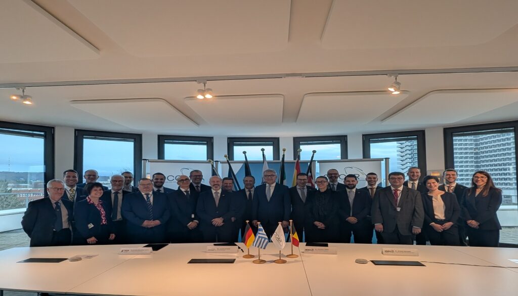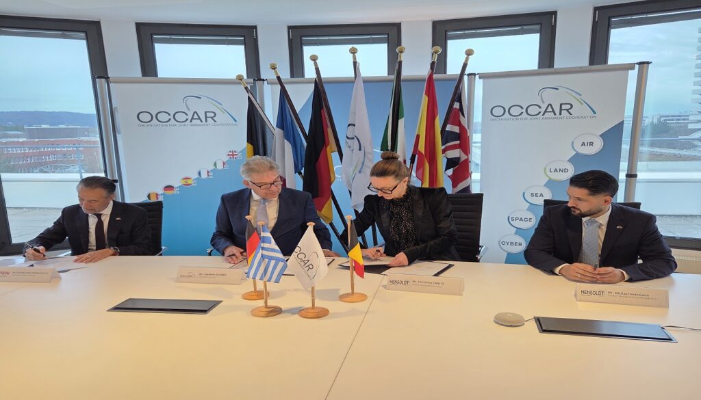 Στιγμιότυπο από την υπογραφή της συμφωνίας: Εκπρόσωποι από τον OCCAR, τα Υπουργεία Άμυνας της Γερμανίας και του Βελγίου, τη THEON και την Hensoldt