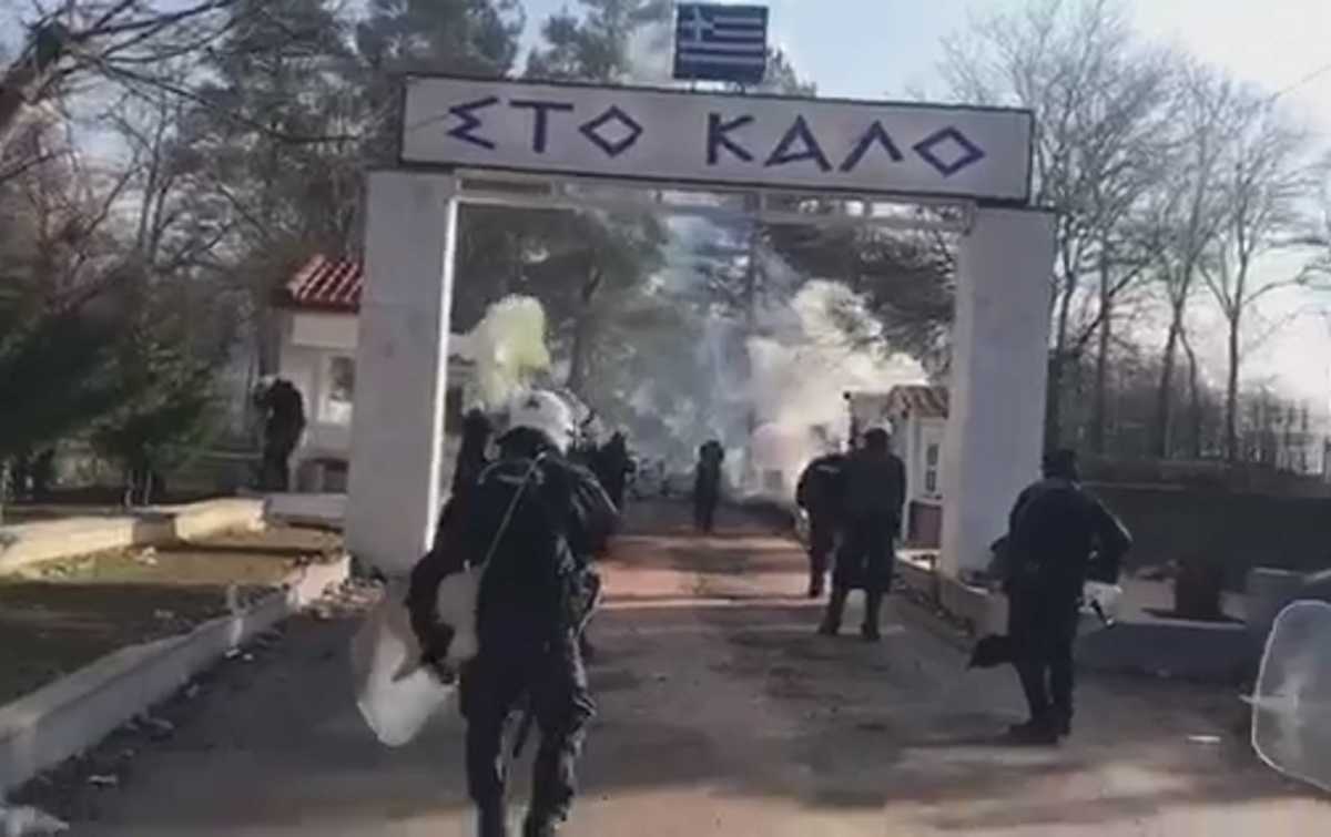 Διμοιρίες της ΥΑΤ κάνουν χρήση χημικών ενώ υδροφόρες της Αστυνομίας ρίχνουν μπλε υγρό προς τους λαθρομετανάστες.