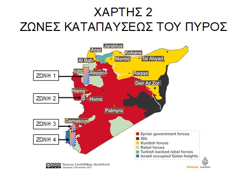 Μια δεύτερη εστία αποτελεί η διαμάχη μεταξύ Ισραήλ και Ιράν. Τα τελευταία 20 χρόνια, ο νυν πρωθυπουργός του Ισραήλ κ. Νετανιάχου, αποκαλεί το Ιράν «υπαρξιακή απειλή» για το Ισραήλ, ο δε πόλεμος στην Συρία, έδωσε την δυνατότητα σε ιρανικές δυνάμεις που συμμετέχουν στον πόλεμο, να φθάσουν σε απόσταση 5 Χλμ από τα υψώματα του Γκολάν. Οι δυνάμεις αυτές ανήκουν στην επίλεκτη δύναμη Quds των Φρουρών της Επαναστάσεως, την οποία διοικεί ο Στρατηγός Soleimani. Ο Soleimani έχει απ’ ευθείας πρόσβαση στον Πρόεδρο του Ιράν Hassan Rouhani. Διαρκής φόβος του Ισραήλ, είναι η μόνιμη εγκατάσταση δυνάμεων του Ιράν στα σύνορα Συρίας-Ισραήλ. Αυτό μπορεί πράγματι να γίνει, εφ’ όσον ιρανικές δυνάμεις εξασφαλίσουν μόνιμο λόγο υπάρξεως στην Συρία. Και τον λόγο αυτό τους τον παρέχει η συμμετοχή τους ως εγγυητριών δυνάμεων σε κάποιες εκ των τεσσάρων ζωνών καταπαύσεως του πυρός (de-escalation zones) που υιοθετήθηκαν ως αποτέλεσμα των επτά γύρων συνομιλιών μεταξύ Ρωσίας-Τουρκίας και Ιράν, που έλαβαν χώρα κατά την διάρκεια του τρέχοντος έτους, στην Αστάνα του Καζακστάν. (Βλέπε Χάρτη 2)
