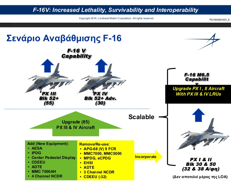 Όμως το μεγαλύτερο ερώτημα είναι γιατί δεν εφαρμόζεται η πρόταση της Lockheed Martin όπως αυτή διαφημίζονταν το (όχι και τόσο) μακρινό 2018 – 2019, βάση του οποίου τα F-16 Block 50 και F-16 Block 30 θα εκσυγχρονίζονταν έναντι ενός κόστους περί τα 700 – 800 εκατομμύρια ευρώ αξιοποιώντας τα απάρτια (ηλεκτρονικά συστήματα όπως το ραντάρ) των F-16 Block 52+ και F-16 Block 50+ Advanced τα οποία θα εγκαθιστούσαν τα νέα συστήματα των F-16 Block 70 Viper. Τελικά η πρόταση της Lockheed Martin δεν είναι τεχνικά εφικτή να υλοποιηθεί; Ή είναι και δρομολογείται η προμήθεια νέων μαχητικών απαξιώνοντας μια ικανή δύναμη μαχητικών; Σε κάθε περίπτωση γιατί να μην αξιοποιηθούν τα απάρτια των F-16 Block 52+ και F-16 Block 50+ Advanced; Το ζητούμενο όπως έχουμε επιχειρηματολογήσει δεκάδες φορές είναι η προμήθεια νέων όπλων κρούσης για τα F-16 είτε αμερικανικής είτε ισραηλινής είτε ευρωπαϊκής προέλευσης και φυσικά η πρόσκτηση νέων ατρακτιδίων στόχευσης – αεροναυτιλίας και όχι η αγορά πανάκριβων νέων αεροσκαφών… Είναι οικονομικά αποδοτικό να εκσυγχρονιστούν τα Block 30 πρώτα από όλα γιατί στο παρελθόν δαπανήθηκαν σημαντικά κονδύλια για την αναβάθμιση των κινητήρων τους (ένα εκατομμύριο δολάρια ανά μονάδα…), αλλά και για την επέκταση του ορίου της ωφέλιμης πτητικής ζωής τους μέσω δύο προγραμμάτων (Falcon UP και Falcon STAR). Ενώ δηλαδή είναι παλιότερης κατασκευής σε σχέση με τα Block 50, από δομικής πλευράς είναι νεότερα (τα αεροσκάφη αυτά φέρουν τον ίδιο κινητήρα με τα Block 50, F110 της GE).