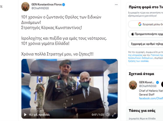 Με μια ανάρτηση στο «Twitter» ο Α/ΓΕΕΘΑ, Στρατηγός Κωνσταντίνος Φλώρος, τίμησε τον Στρατηγό Κωνσταντίνο Κόρκα, ο οποίος πριν λίγες ημέρες συμπλήρωσε 101 έτη ζωής: «101…