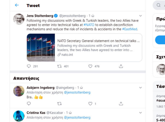 Με ανάρτηση του στο «Twitter» ο Γενικός Γραμματέας του ΝΑΤΟ, Γενς Στόλτενμπεργκ, ανακοίνωσε ότι Ελλάδα και Τουρκία συμφώνησαν στην έναρξη τεχνικών συνομιλιών στο NATO: «Σε…