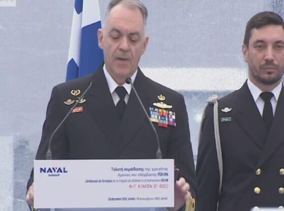 Η ένταξη της φρεγάτας «Κίμων» αλλά και των επόμενων τριών φρεγατών FDI HN δημιουργεί το ισχυρότερο Ναυτικό που είχε ποτέ ο ελληνισμός. Η Ελλάδα ισχυροποιείται όχι για να απειλεί αλλά για να προστατεύει, να εγγυάται, να αποτρέπει προτάσσοντας το δίκαιο απέναντι στην ισχύ. Αυτό τόνισε ο υπουργός Εθνικής Άμυνας, Νίκος Δένδιας, σε ομιλία του, σήμερα, Πέμπτη 18 Δεκεμβρίου, στην τελετή ονοματοδοσίας και ύψωσης της ελληνικής σημαίας στην πρώτη φρεγάτα FDI HN «Belh@rra» F-601 «Κίμων», στα ναυπηγεία της Naval Group, στην πόλη Λοριάν της Γαλλίας. Ανέφερε ότι για τον ίδιο αποτελεί μεγάλη τιμή «η ύψωση της ελληνικής σημαίας στη φρεγάτα Κίμων» καθώς η Ελλάδα «ζει και αναπνέει μέσα από τη θάλασσα». «Δεν νοείται», είπε, «το Πολεμικό Ναυτικό χωρίς ισχυρές δυνατότητες. Χωρίς τη ικανότητα να βρίσκεται έγκαιρα εκεί που διαμορφώνονται τα συμφέροντα του ελληνισμού». Ο «Κίμων» επιστρέφει στη Μεσόγειο «για να υποδηλώσει τη σημερινή ισχύ της Ελλάδας» προσέθεσε.